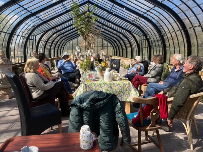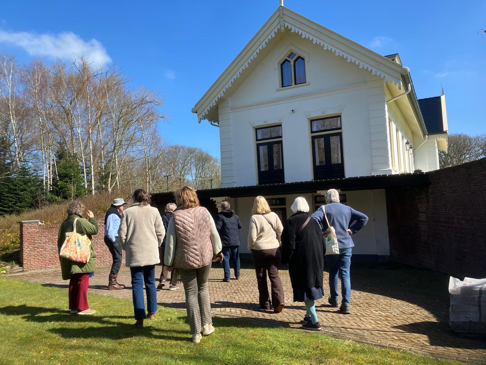 Meteen bij aankomst viel de perfecte uitstraling van het in 1881 gebouwde landhuis met de omringende Engelse tuin met een weelde aan stinzenplanten op. Wat een paradijselijke locatie waar echter ook nog volop aan de restauratie van de Oranjerie wordt gewerkt. We werden ontvangen in de nieuwgebouwde kas die in dit weer ook echt als een ‘hothouse’ fungeerde. Pieter beschreef ons het ontstaan van zijn betrokkenheid met het landgoed dat, hij amper 30 jaar oud, in 1984 kocht. Vanaf dat moment ving een tot de dag van vandaag voortdurend bouwproject aan. Waarbij niet alleen het landhuis met omringende gronden maar ook de bijgebouwen punctueel werden gerestaureerd maar er ook passende nieuwbouw plaatsvond. Vijf gebouwen hebben inmiddels de status van Rijksmonument.
